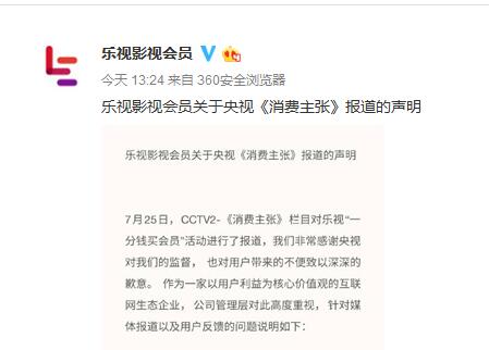 26日晚★=,CCTV2-《消费主张》报道称,用户可以在乐视网站1分钱享受7天高级会员服务=•。不过在7天之后,视频网站竟会自动续费●,甚至长时间都不会告知消费者。乐视电影付费服务官方微博发布声明,称将对所有参与过七日体验计划的用户赠送价值198元的一年会员时长。