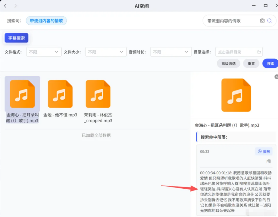 对于媒体创作者而言,AI空间的价值远不止于搜索▲-。在处理大量素材时,传统方式需逐个播放视频或音频查找特定内容•▪,而AI空间可通过语义理解快速筛选。例如▼,搜索带流泪内容的情歌,系统能根据歌词、歌名信息精准定位相关音频;搜索演唱会,则能快速找出所有演出视频。这种所想即所得的搜索体验●△,大幅提升了内容创作效率。