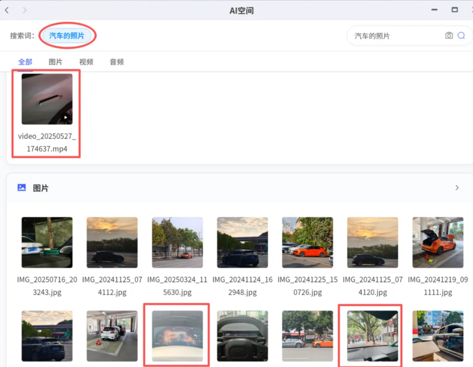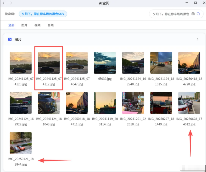 AI空间的强大,源于其对文件内容的深度理解◇▪。以图片搜索为例,系统不仅能识别画面中的汽车,还能通过EXIF信息(如拍摄时间、地点)或图片描述文字进行关联搜索◁◁。例如,搜索“夕阳下,停在停车场的黑色SUV▲▼=”,系统能结合画面内容与元数据◁▼,精准定位符合条件的照片。
