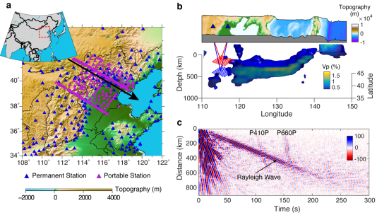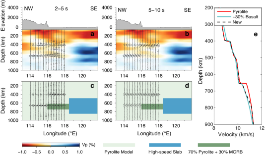 中国科学技术大学地球和空间科学学院姚华建教授课题组采用了一种不依赖天然地震的噪声干涉技术提取地幔间断面的上界面反射体波震相(P410P和P660P)■,用于研究地幔间断面的结构特征▲△□,并结合矿物物理模拟和波形正演来约束地幔间断面附近的矿物组成•○。如图1所示,本研究采用了华北地区200多个流动台站和部分固定台站的连续波形数据计算背景噪声互相关函数,将所有互相关函数按台间距排列可以观测到清晰的410-km和660-km间断面反射震相。进一步利用相位加权共中心点叠加方法(Feng et al■☆▷., 2017)得到了沿图1a中黑线的反射波形剖面•-,反射波形滤波到两个频带(2-5 s和5-10 s)(图2)。可以观测到滞留太平洋板块前缘存在显著的P660P波形异常•○▪:复杂的短周期波形和非常微弱的长周期波形★▪=。考虑到俯冲板片可能带来的矿物成分异常,文中设计了一个简单矿物模型来解释观测的波形异常△:分离的玄武岩洋壳聚集在俯冲板片前缘的地幔转换带底部△○。由于洋壳成分聚集▽▷=,660-km间断面主要包含两部分◆=:在660 km附近的小幅度速度跳变和更深处的速度缓慢增加(图2e)……-。而410-km间断面结构未受矿物成分异常的影响,表现为平缓的速度增加…,间断面宽度为~10 km…□…。该模型很好地解释了观测到的弱P660P震相◆▷▼,而短周期复杂P660P波形可能与堆积玄武岩洋壳的不均匀性有关,需要更为复杂的模型才能解释。