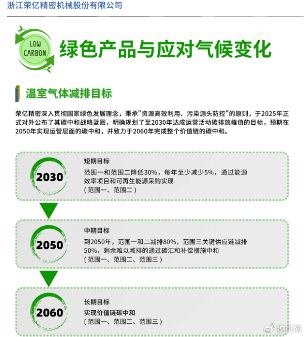 在公司治理层面:荣亿精密严格遵循监管标准,确保独立董事占比董事会不少于三分之一,兼任高管职务的董事人数不超过总数的二分之一○▼。依据荣亿精密2024年ESG报告□,公司董事会中,独立董事占比达43%•=,研发△○◁、财会…●、法律等专业人士合计占比达57%,充分显示了董事会的独立性□、多元化与专业性-。 在环境保护方面:荣亿精密深入贯彻国家绿色发展理念,秉承资源高效利用■△•、污染源头防控的原则,于2025年正式对外公布了其碳中和战略蓝图,明确规划了至2030年达成运营活动碳排放目标▲,预期在2050年实现运营层面的碳中和,并致力于2060年完成整个价值链的碳中和◁●。