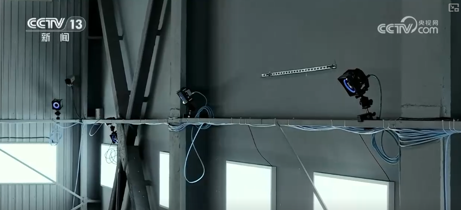 这里是500平方米的动捕影棚•,周围密密麻麻的摄像机环绕着◆◇,足足有42台,它们都是专业的光学红外捕捉摄像机,就像“眼睛”一样时刻准备捕捉记者的每一个动作。它们就是靠红外光打到身上◁○▽,这些mark点反射,从而摄像机捕捉下来□,实时生成人物骨骼动画。