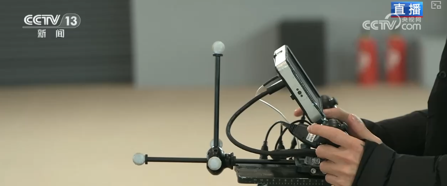 大屏幕上出现了一个虚拟角色,这个角色是一个动画形象,但它接下来的所有动作都将由记者来完成。记者做什么动作,它就会同步做什么。挥挥手▼…,屏幕里的角色也在挥手;走两步,它也跟着迈步,甚至连手臂摆动的幅度都精准复刻●=。这个设备就是一台虚拟摄像机,没有摄像头,但是它可以模拟一个真实摄像机,游走在虚拟的动画空间里。