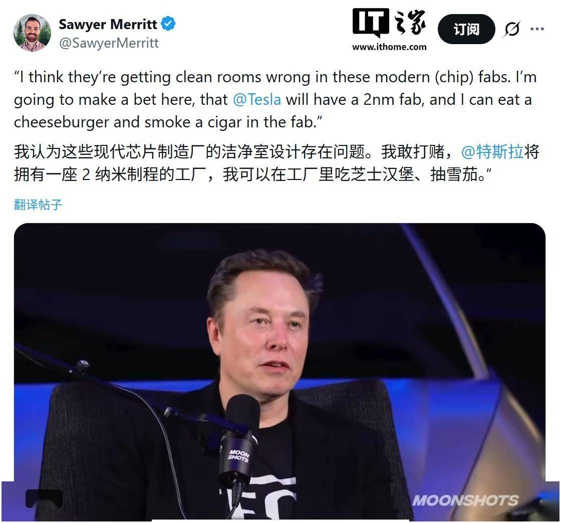 马斯克声称特斯拉拟建的 TeraFab 超级工厂将具备生产 2nm 制程芯片的能力。更为颠覆的是○,马斯克对芯片制造行业的▼“洁净室□○▷”(Cleanroom)标准发起了挑战…,并立下赌约称○…:■▼“特斯拉将拥有 2nm 工厂=○,而我甚至可以在里面一边吃汉堡、一边抽雪茄。••”
