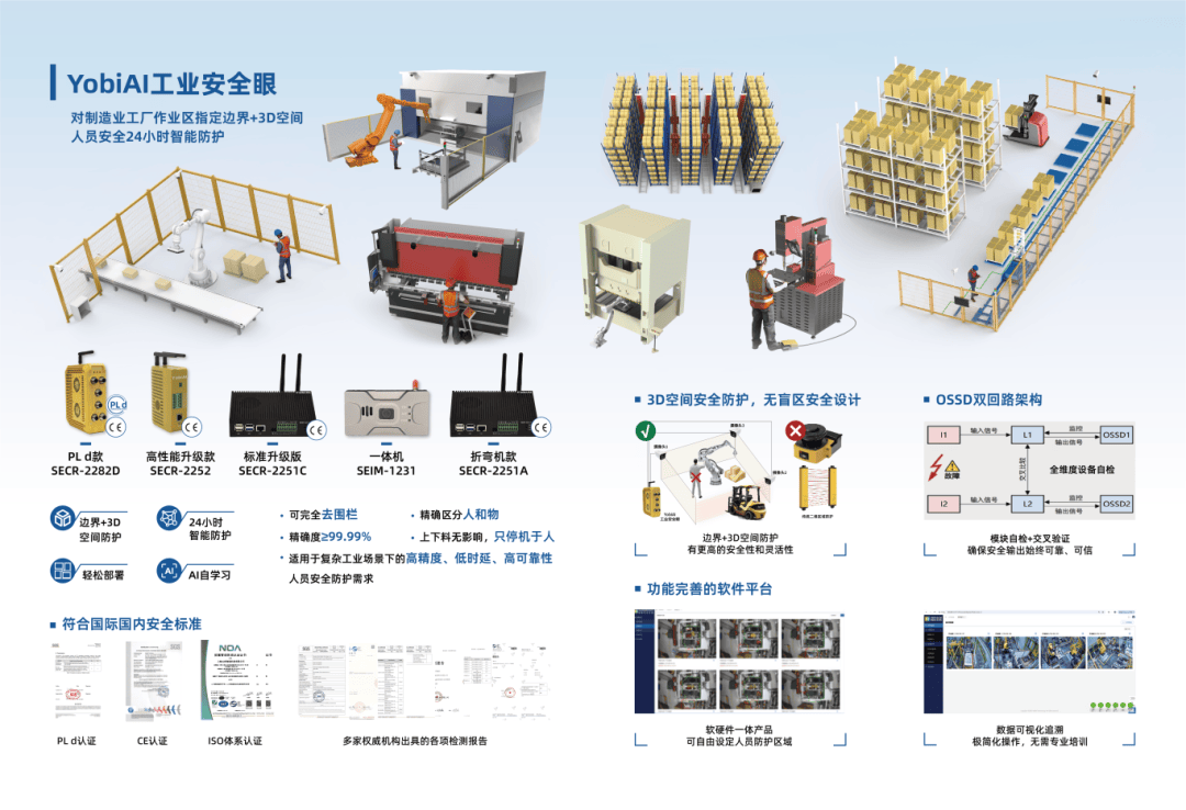 就这样,在一次次技术攻坚和客户反馈的打磨中,YobiAI工业安全眼从最初的概念原型,慢慢变成了国内外首个AI安全视觉标品,现已覆盖工业六轴机器人、协作机器人、折弯机★★、桁架、冲压机床、智能仓库◆、激光切割机、压铆机、铆合机、天车等多个作业区•,成了守护工人安全的“标配▷”。